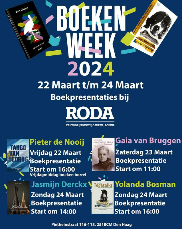In het kader van de boekenweek organiseert boekhandel Roda van vrijdag 22 maart tot en met zondag 24 maart diverse boekpresentaties van auteurs Yolanda Bosman, Jasmijn Derckx, Pieter de Nooij en Gaia van Bruggen.