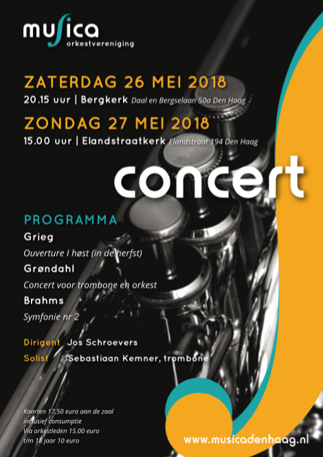 Symfonie-orkest Musica hoopt u ook dit voorjaar te mogen ontmoeten bij één van de twee voorjaarsconcerten. Wederom een bijzonder programma, dit keer vanwege het solo-werk dat Musica gaat spelen. Want het is niet van alledag dat een orkest een trombone solo begeleidt! Sebastiaan Kemner zal het tromboneconcert van Grøndahl ten gehore brengen.