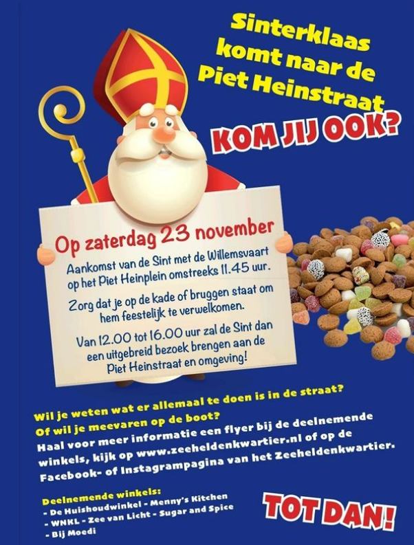 De Sint zal dan van 12.00 tot 16.00 uur een uitgebreid bezoek brengen aan de Piet Heinstraat en omgeving.