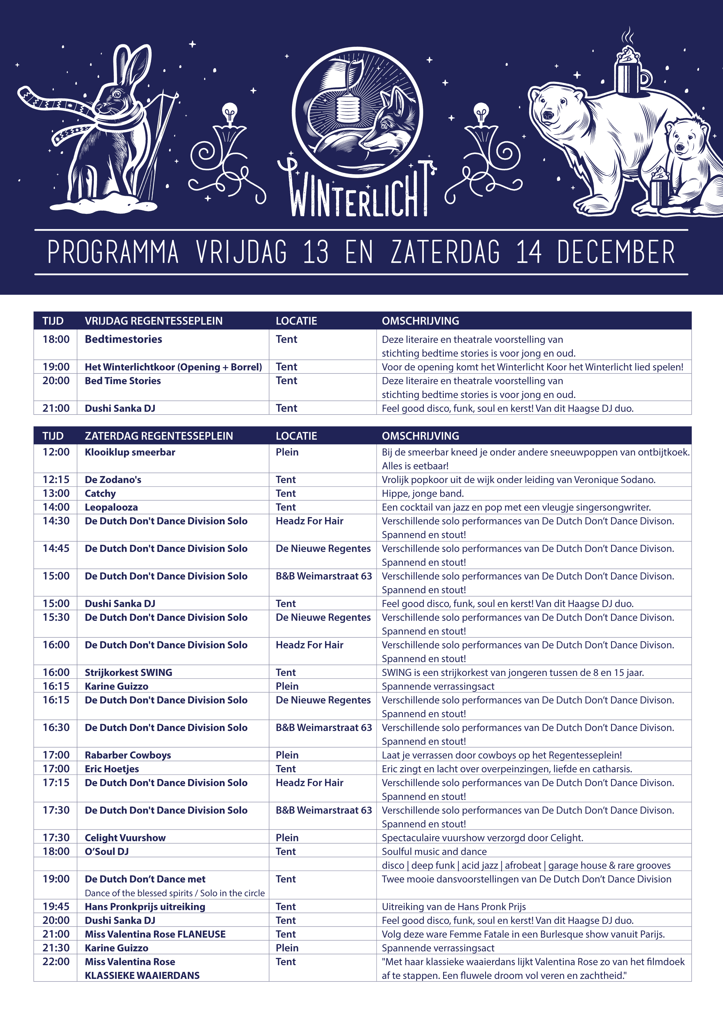 Op 14 december waan je je even in winterwonderland. Tussen 12:00 en 22:00 uur veranderen het Regentessen- en Zeeheldenkwartier in een supersfeervolle route langs toffe lokale ondernemers. Je ontdekt alle plaatselijke pareltjes! Ook als het op eten aankomt, want lunchrooms en restaurantjes zijn er genoeg. Tussendoor bijtanken doe je op de drie pleinen die je tegenkomt. Even geen puf meer? Het schattige Winterlicht Express treintje voert je gratis naar de volgende bestemming...