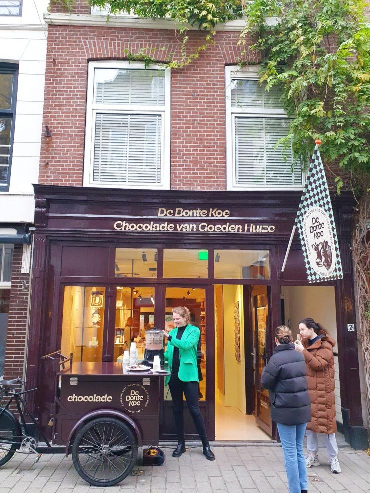 Koffie en chocolade. Alle koffie gaat vergezeld met een mooi aansluitend product van een Haagse chocolatier, speciaal ontwikkeld op de smaak van de bestelde koffie.